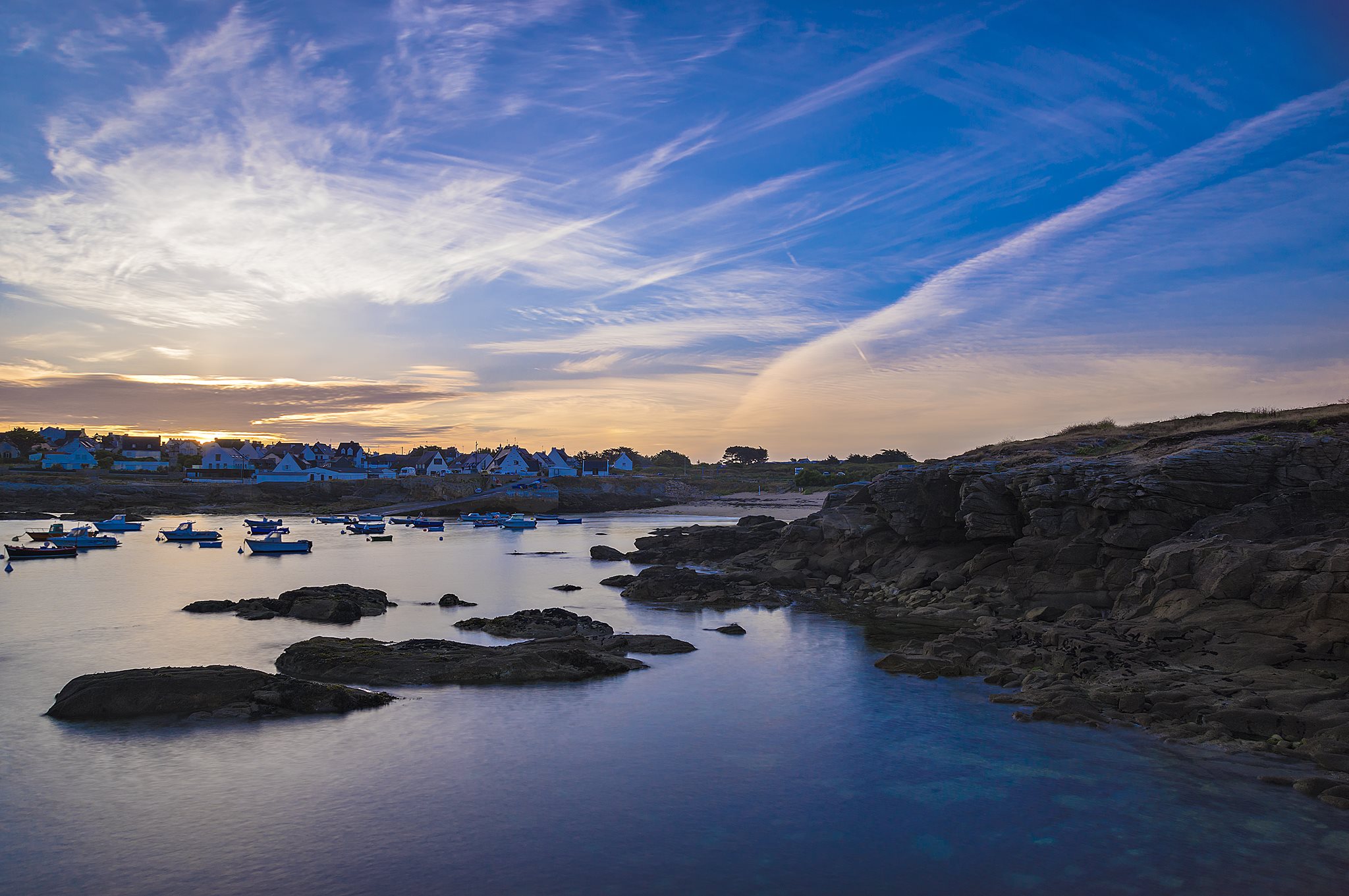 La plage de Port blanc – Kerroch est une plage familiale de sable fin de 100 mètres de long entourée de rochers. Exposée Nord-Ouest.