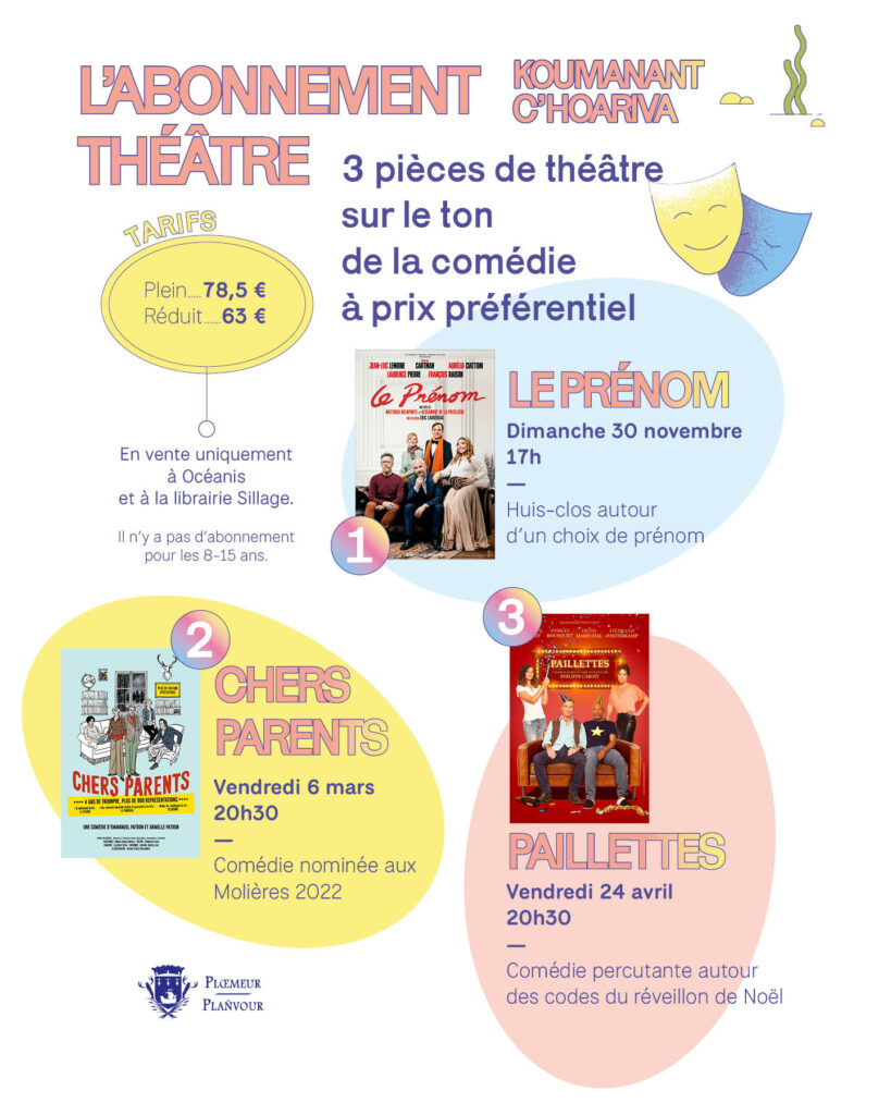 Tarifs réduits pour les spectacles organisés par la ville de Plœmeur. Les billets peuvent être achetés à Océanis avant le soir du spectacle ou sur Internet via les réseaux France Billet et Ticketmaster.